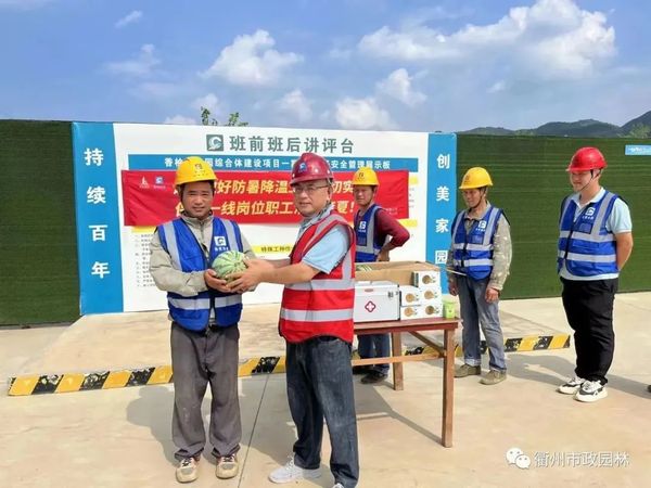 对酷暑天气还坚守一线的施工人员表示感谢,为他们送上了“高温慰问大礼包”,礼包内含有霍香正气水、人丹、清凉油、矿泉水、西瓜等防暑降温物品,并叮嘱项目部做到一、落实以“人民为中心”发展思想,坚持生命至上。二、推进科学防暑,合理安排工作时间,倡导延时错峰作业。三、敬惕热射病等高温疾病,建议职工随身携带防暑降温药品和饮用水,一旦身体不适,立即吃药就医。四、全力做好高温防暑工作,高度重视动火作业和高温用电安全,加大日常巡检力度,严防高温火灾风险。